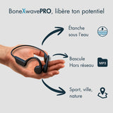 Le casque BoneXwaveÂź est certifiĂ© IPX8, cela signifie que l'appareil peut ĂȘtre immergĂ© Ă une profondeur supĂ©rieure Ă 1 mĂštre pendant une durĂ©e prolongĂ©e et qu'il est protĂ©gĂ© contre les effets d'une immersion continue dans l'eau, que ce soit en piscine ou sous la douche.