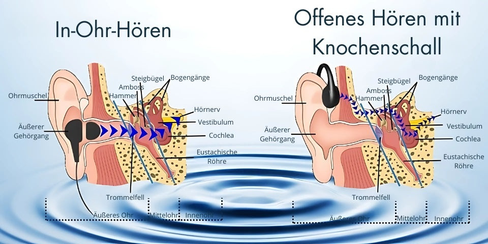 Die patentierte Knochenleitungstechnologie basiert auf einem innovativen Prinzip, das unsere Klangwahrnehmung revolutioniert. Im Gegensatz zu herkömmlichen Kopfhörern, bei denen die Schallwellen durch die Luft übertragen werden und dabei durch den Gehörgang und das Trommelfell gehen, nutzt diese Technologie einen Übertragungsmodus durch Vibrationen, die direkt ins Innenohr geleitet werden.